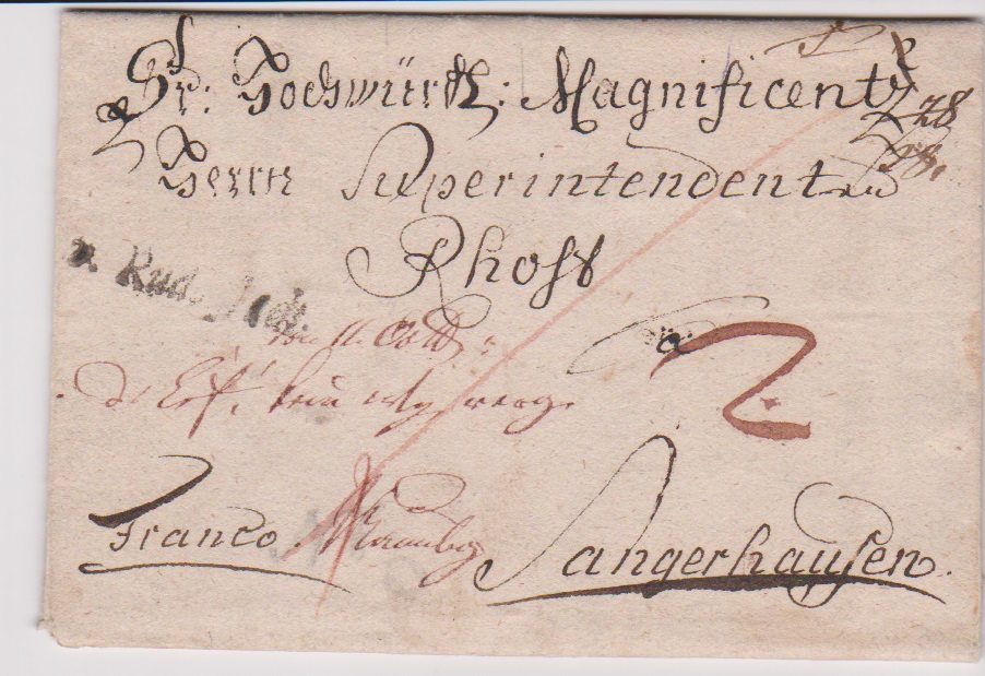 "Rudolstadt", 1798 (Inhalt aus Saalfeld), erster L1 "v. Rudolstadt" auf Brief mit Inhalt nach Sangerhausen, interessante Taxen und Vermerke