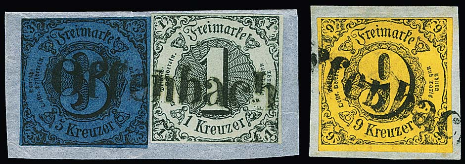 "Offenbach", L1 voll auf Briefstück mit meist gut geschnittenen 1 und 3 Kr., erste Ausgabe, sowie auf Kabinettbriefstück mit kleiner rechter unterer Bogenecke 9 Kr. (sign. Sem)