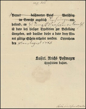 "Oppenheim", 1785, Ortsdruck-Reichspostschein (seltenes Formular) der Fahrpost ("1 Paquet"), "kaiserl. Reichs Postwagen Expedition dahier"