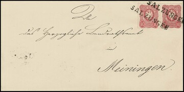 "Salzungen", nachverw. L1 klar auf zwei Briefen 10 Pfge. (ein Paar, ein Brief doppelt verwendet, dadurch kl. Einriß)