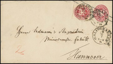 "Oerlinghausen", nachverw. K1 auf Brustschild-Ganzsache 1 Gr. gr. Schild (leichte Gebrauchsspuren), sowie auf zwei 1/2 Gr.-Karten