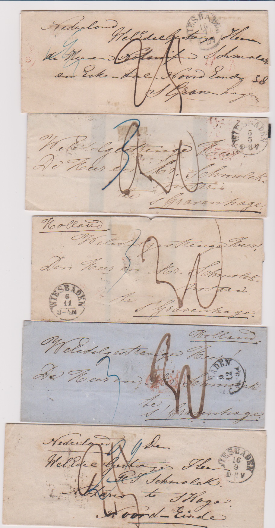 "Wiesbaden", 1863-65, K1 auf fünf Damenbriefchen aus einer Korrespondenz nach Den Haag/Holland, zwei kl. Papiermängel