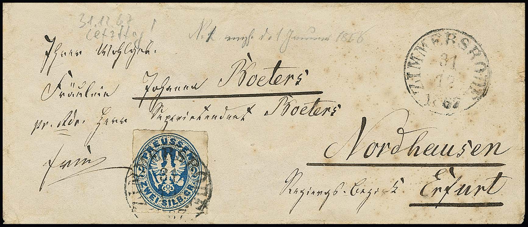 "Zimmersrode", nachverw. K1 auf drei Preußen-Couverts je mit 2 Sgr. blau aus einer Korrespondenz, dabei seltener Letzttagsbrief (etwas fleckig) vom 31.12.67