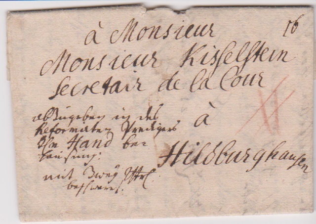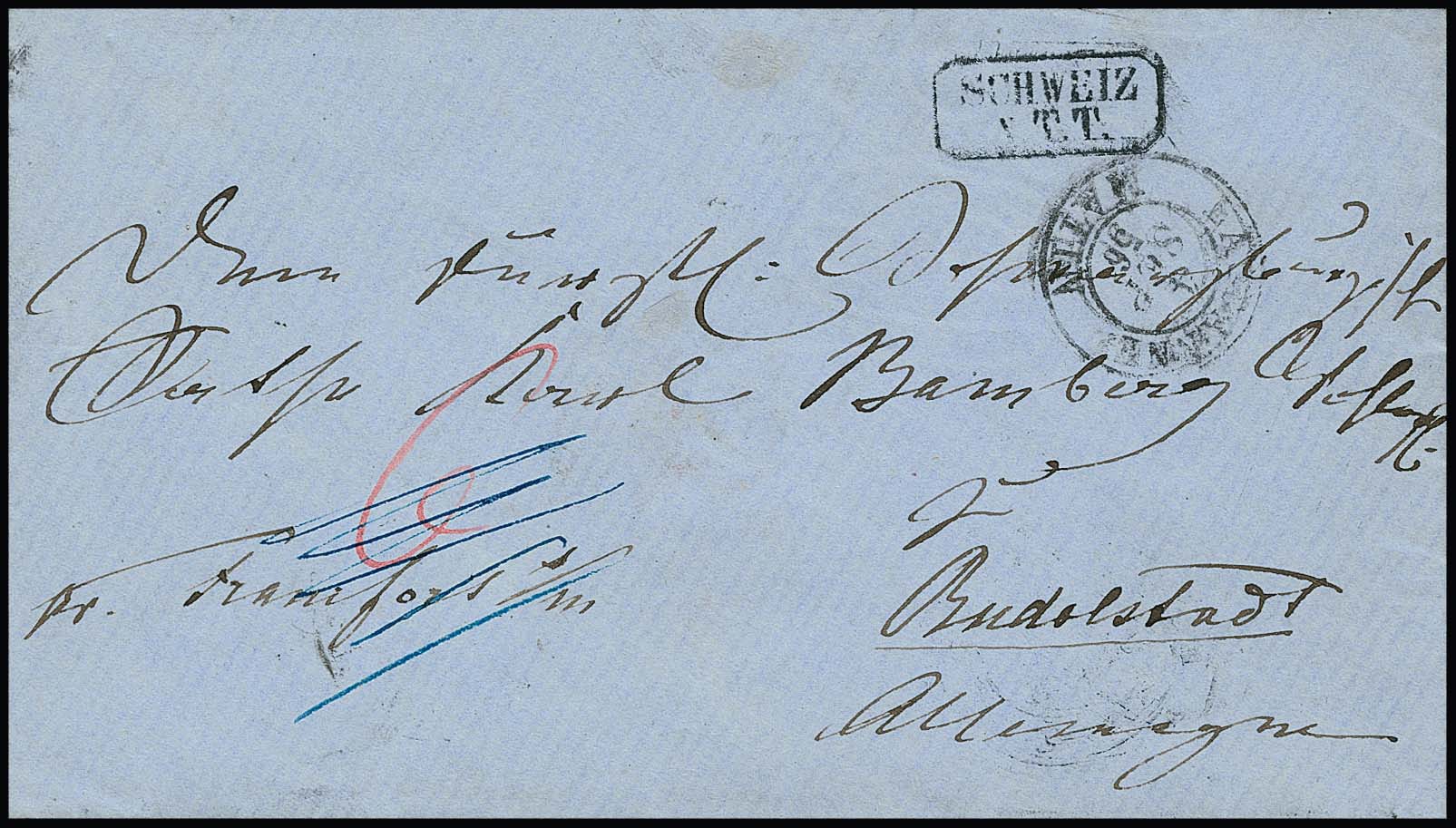 Incoming-Mail, 1856, Brief aus Lausanne/Schweiz an ein Mitglied des Fürstenhauses in Rudolstadt, via Frankfurt (Ra2 "Schweiz N.T.T."). Da der Empfänger Portofreiheit in Taxis genoß, wurde der Schweizer Anteil von 6 Kr. wieder gestrichen und der Brief portofrei zugestellt