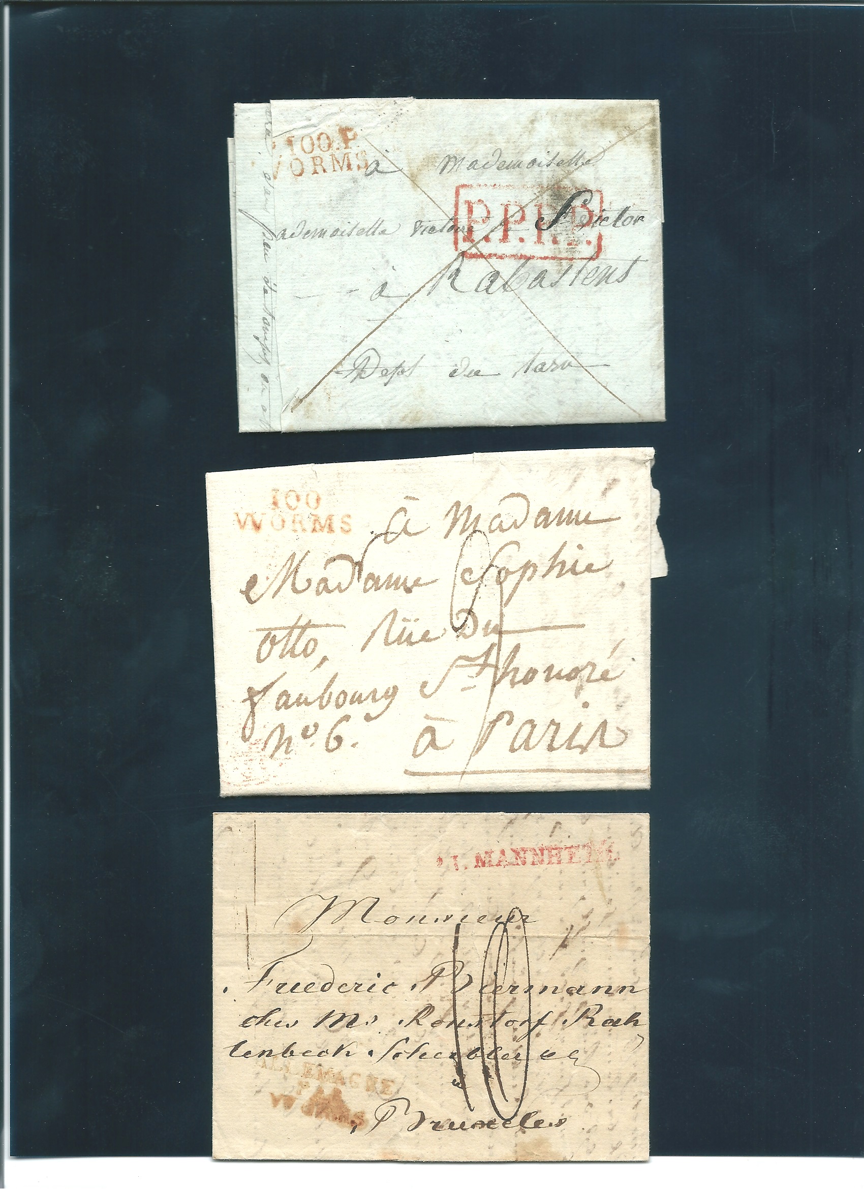 "Worms", 1812, je L2 "100 WORMS" bzw. "P.100.P. WORMS" auf zwei kleinen Briefen (einer links verkürzt), dazu Brief mit L3 "ALLEMAGNE PAR WORMS" und L1 "R.1. MANNHEIM" (1812)
