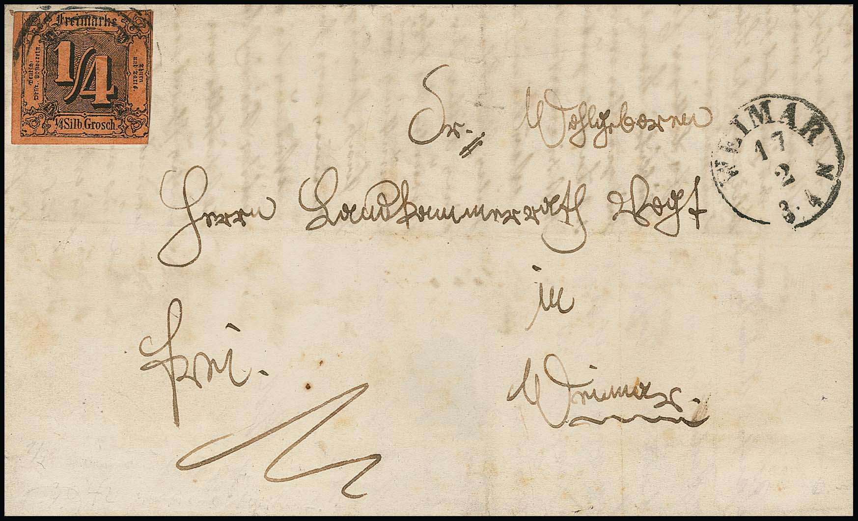 1/4 Sgr. schw./braunorange, etwas berührte linke untere Bogenecke einzeln auf Ortsbrief (leichte Patina) aus Weimar