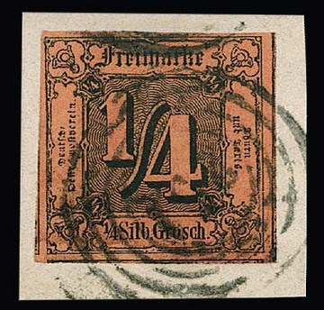 1/4 Sgr. schw./rotbraun, überrandig, drei Seiten Nebenmarken, auf Kabinettbriefstück, sign. Bühler