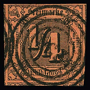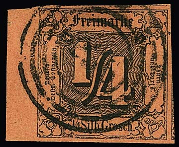 1/4 Sgr. schw./braunorange, breitrandiges linkes Luxus-Randstück, zwei Seiten Nebenmarken, sign. Sem