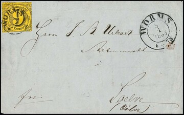 "Worms", seltener kleiner Versuchs-K1 ohne Datum, K2 vom 5.1.1853 nebengesetzt, auf Briefvorderseite mit Taxis erste Ausgabe 9 Kr. (Taxisschnitt)