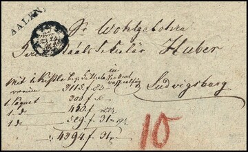 "Aalen", (1805) L1 nebst seltenem Fahrpost-K2 "Aalen R.3" auf Wertpaketbegleithülle nach Ludwigsburg, Feuser 3-4, 2500,-