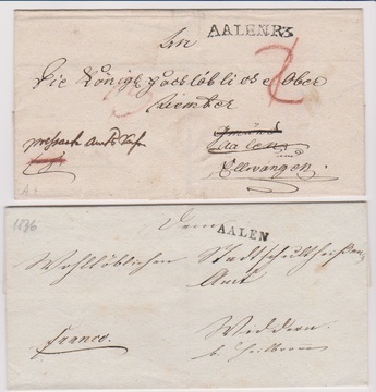 "Aalen", L1 und seltener Rayon-L1 (dopp. verw. Brief, daher ohne Inhalt, aber amtlich datiert 1814) auf zwei Briefen, Feuser 3-2, -3