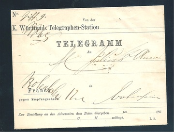 "Brackenheim", (1865), Telegrammcouvert in den eigenen Landbezirk nach Botenheim, hs. "Botenlohn 12 xr"
