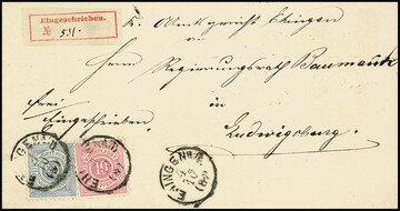 10 Pfg. rosa und 20 Pfg. ultramarin (min. Zahnfehler), auf R-Brief aus Ehingen a. d. D., 4.10.1875, mit erstem R-Zettel