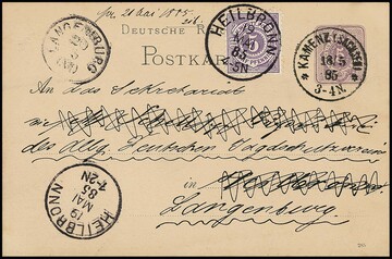 5 Pfg. als interessante Nachsendefrankatur auf Postkarte 5 Pfg. Deutsches Reich 1885 von Kamenz nach Heilbronn und von dort mit der Württemberg 5 Pfg. nach Langenburg
