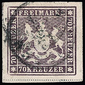 70 Kr. braunlila, Bogenfeld 6, allseits aussergewöhnlich breitrandig, K1 von Esslingen, in tadelloser Erhaltung. Attest Heinrich "... einwandfrei. In diesem breitrandigen Schnitt seltene Marke!". Mi. 7000,-
