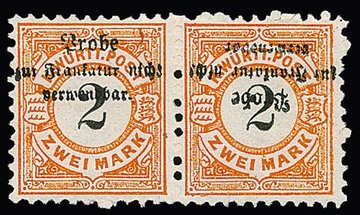 2 Mk. schw./orange im ungebrauchten Paar mit Aufdruck "Probe zur Frankatur nicht verwendbar", auf der rechten Marke kopfstehend (sehr selten!), linke normal