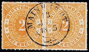 2 Kr. orange, schön gestempeltes Paar mit zentr. K2 "Mainhardt", rechte Marke min. Durchstich-Unebenheit, sonst gut. Fotoexp. Heinrich. Mi. 450,-