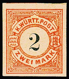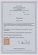 2 Mk., geschnittener Probedruck in abweichendem Farbton dunkelorange, schwarze Wertziffer, auf gröber strukturiertem Papier, ungebraucht mit Originalgummi. Nur wenige Exemplare bekannt, im Michel nicht gelistet. Attest Winkler "ausserordentlich selten", ferner sign. Thoma