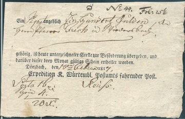 "Dörzbach", 1817, Ortsdruck-Postschein "Expedition K. Würtembl. Postamts fahrender Post"