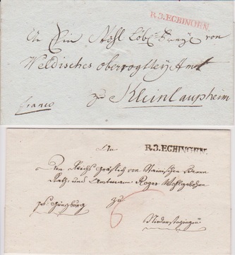 "Ehingen", (1810), "R.3. ECHINGEN", L1 in rot und schwarz auf zwei dekor. Briefhüllen