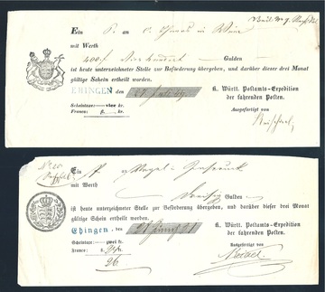 "Ehingen", 1849/1851, blauer L1 (einmal Fraktur) auf zwei Postscheinen