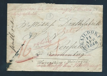"Gaildorf", 1848, blauer Stb. auf Irrläufer- und Retourbrief nach Neuhaus/Thüringen, rs. roter L2 "Sonneberg" und roter K1 "Wallendorf"