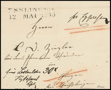 "Esslingen", L2 1845 auf seltenem Land-Expreßbriefchen (unten fehlt ein Klappenteil) nach Gingen bei Geißlingen. Für die expresse Landbestellung gemäß hs. Vermerk "für botenlohn 30 x" berechnet