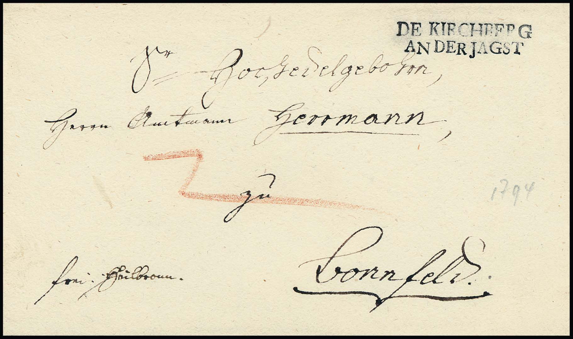 "Kirchberg", (1794), ausgesprochen schöner Abschlag des ersten L2 "DE KIRCHBERG AN DER JAGST" auf Brief, Attest Thoma, Feuser + 800,-
