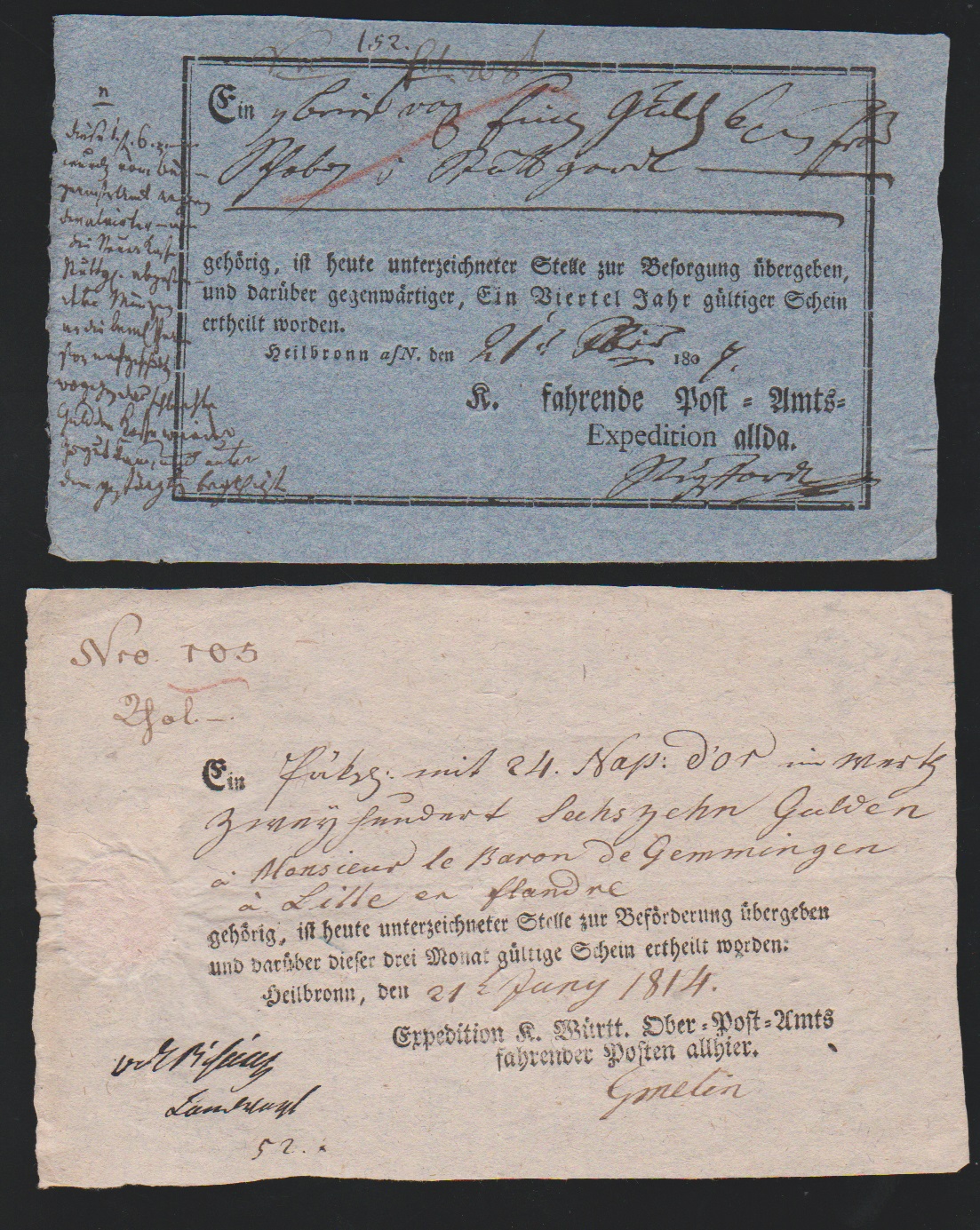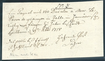 "Heilbronn", 1758, früher hs. Postschein "fahrende Post dahir" über ein Paket