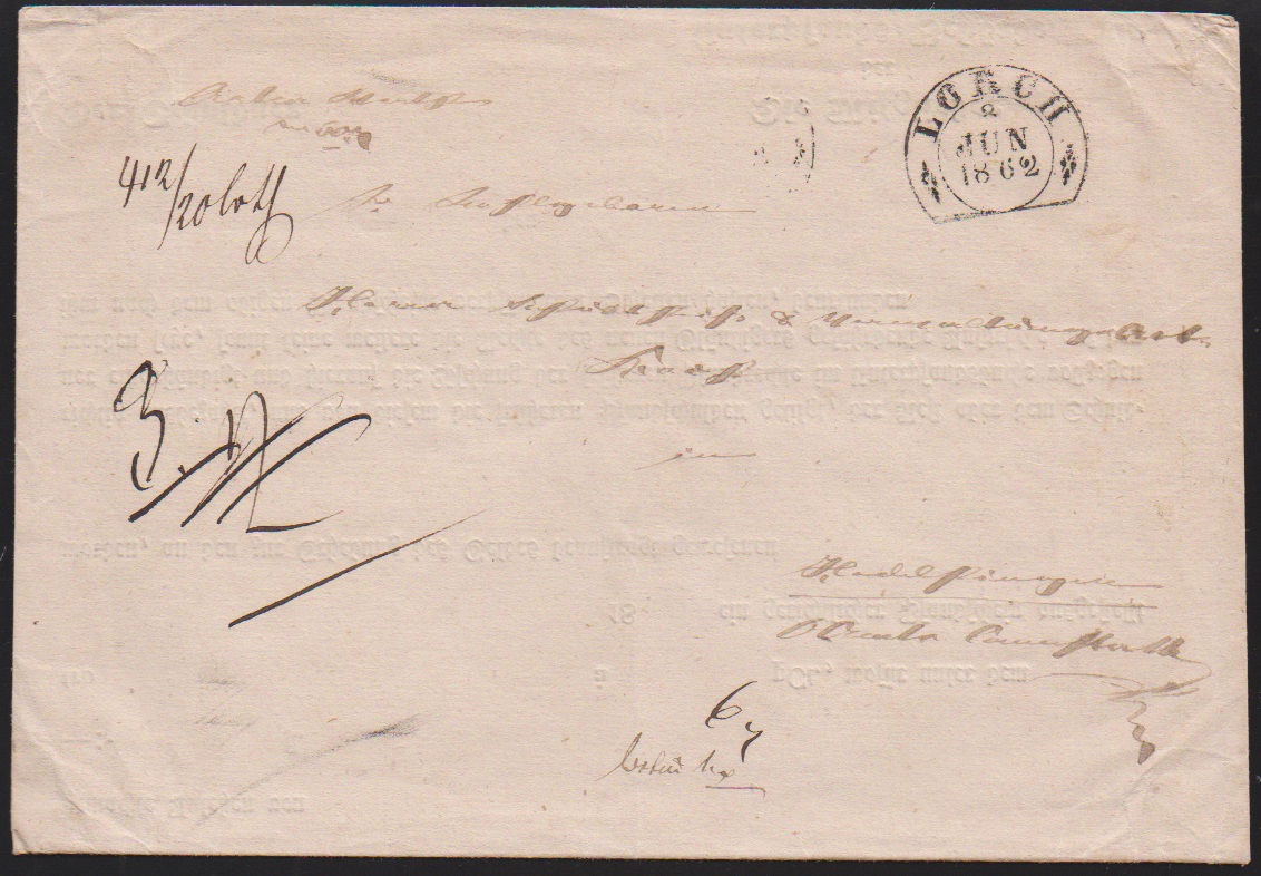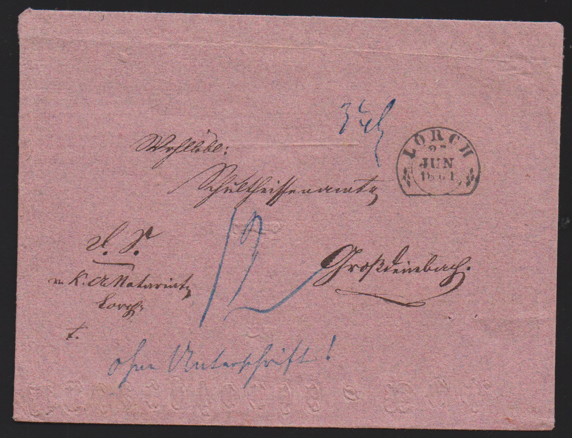 "Lorch", 1861-1872, Stb. auf vier unfrankierten Briefen, dabei 4. (hs. "12" Kr.) und 5. Gewichtsstufe (erst als Brief und dann als Drucksache nachtaxiert)