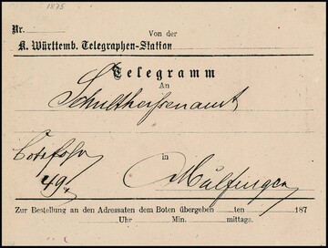 "Künzelsau", 1875, kpl. Telegramm, Couvert mit Inhalt, in den eigenen Landbezirk nach Mulfingen, hierfür enorme "49 Xr." Bestellgeld erhoben für den gesonderten Expreß-Boten und diese sowohl auf dem Couvert als auch auf dem Telegramm rs. quittiert