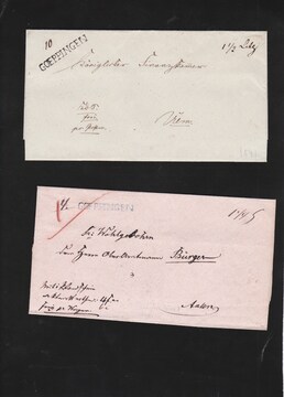 "Goeppingen", ca. 1840-1848, klarer L1 in schwarz bzw. blau auf zwei dekor. Fahrpostbriefen (Hüllen), Feuser 1176-8