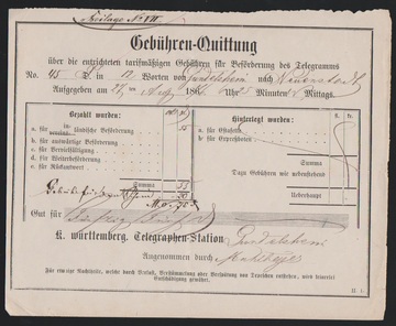 "Gundelsheim", 1876, Gebühren-Quittung für ein Telegramm nach Neuenstadt