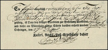 "Oehringen", 1805, seltener Ortsdruck-Reichspostschein der Fahrpost aus dem Krieg gegen Napoleon über ein Paket in das preußische Hauptquartier nach Gera