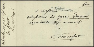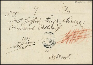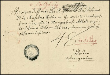 "Ravensburg Recommandirt N.", (1790), sehr schöner Abschlag des Negativstempels als Transit- bzw. Ankunftsstempel auf Charge-Briefhülle aus Salzburg nach Weingarten, hs. in rot "V. SALZBURG" und "48 Auslag", sowie dekoratives Chargegitter, eine große Rarität aus der Sammlung Weidelt, lt. Attest Thoma der beste ihm bekannte Abschlag