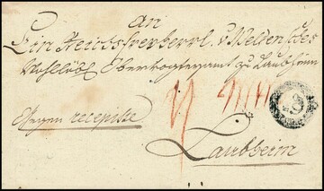 "Ravensburg", (1790), Negativstempel "Recommandiert V. Ravensburg N." klar auf Briefhülle nach Laupheim. Nur wenige Belege belegt, da nur kurz verwendet und dann wegen schlechter Lesbarkeit des Stempels wieder eingezogen. Feuser 2500,-, Attest Thoma