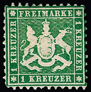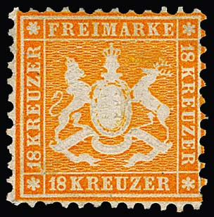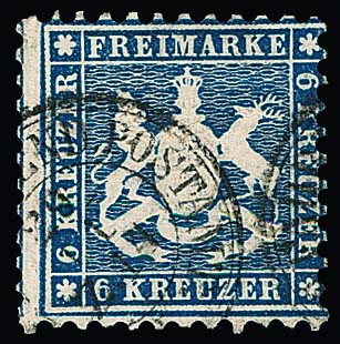 18 Kr. blau, optisch eine schöne Marke mit klarem K2 "Stuttgart", repariert, Fotoexp. Heinrich. Mi. 2800,-