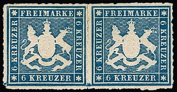 6 Kr. blau, seltenes ungebrauchtes Paar mit Originalgummi (linke Marke min. "eckrund"), Attest Heinrich