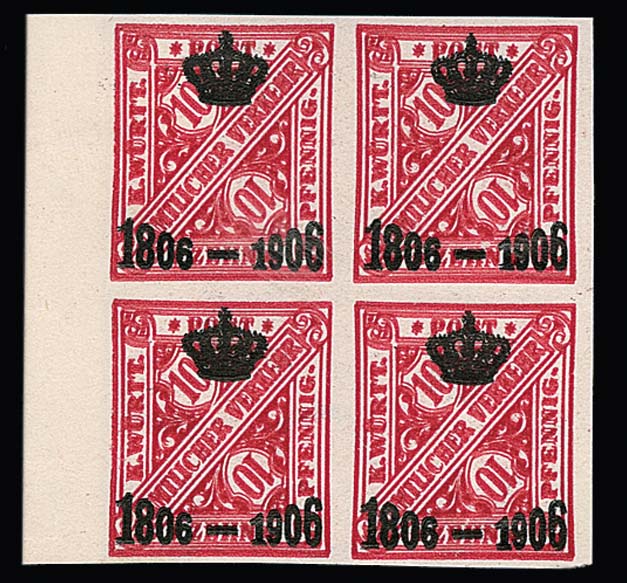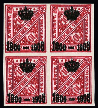 10 Pfg. Krönchen-Aufdruck mit Doppeldruck der Urmarke und des Aufdrucks im ungezähnten Viererblock