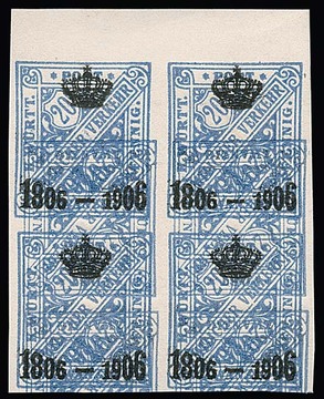 Krönchen-Aufdrucke, fünf verschiedene ungezähnte Andruck-Viererblöcke je auf Kanzleipapier, 10, beide Farben der 20, und 50 Pfg. je mit Doppeldruck der Urmarke, sowie 20 Pfg. nochmals mit normalem Druck, seltenes Angebot!