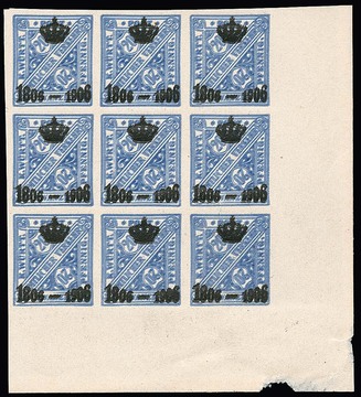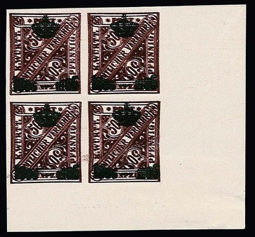 50 Pfg. Krönchen-Aufdruck mit Doppeldruck der Urmarke und des Aufdrucks im ungezähnten Viererblock aus der rechten unteren Bogenecke