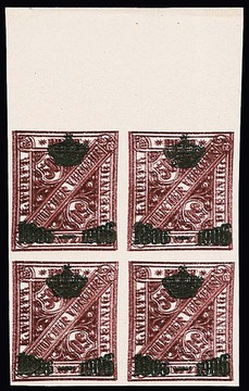 50 Pfg. Krönchen-Aufdruck mit Doppeldruck der Urmarke und des Aufdrucks im ungebrauchten Viererblock vom oberen Bogenrand