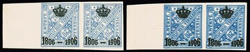 20 Pfg., beide Farben je als ungezähnte Probedruck-Paare vom Rand, einmal sowohl Doppeldruck der Urmarke als auch des Aufdrucks