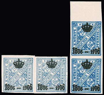 20 Pfg. Krönchen-Aufdrucke, drei versch. ungezähnte Andruck-Viererblöcke je auf Kanzleipapier aus der Bogenecke (2) bzw. vom Rand: beide Farben jeweils als Doppeldruck der Urmarke, sowie 20 Pfg. nochmals als normaler ungez. Viererblock