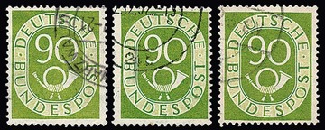 90 Pfg. Posthorn, alle drei Plattenfehler als gestempelte Bedarfsstücke, zwei Werte mit üblich etwas unregelmäßiger Zähnung (siehe Foto). Mi. 2500,-, ein seltenes Angebot!