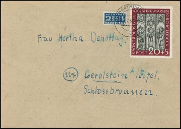 Marienkirche, zwei Briefe mit seltenen Plattenfehlern: 10 Pfg. mit PF I, nebst 20 Pfg., auf Auslandsbrief nach England, sowie 20 Pfg. mit Plattenfehler "Sprung im mittleren Fresko" auf Bedarfsbrief aus Dortmund. Mi. einmal "-.-", letzterer 1200,- ++