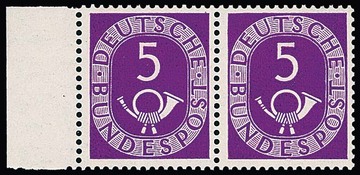 5 Pfg. Posthorn im postfrischen waagerechten Randpaar, rechte Marke seltener Teilauflagen-Plattenfehler "Delle unten im Rand unter E", Attest D. Schlegel. Mi. 1200,- +