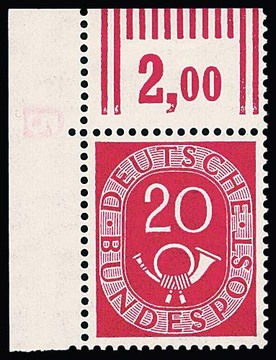 20 Pfg. Posthorn, je postfrisch aus der linken oberen Bogenecke (Rand Falz) und vom rechten Rand mit Abklatsch des Druckerzeichens "5" neg.