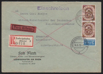 50 Pfg. Posthorn, zwei verschiedene Einzelfrankaturen: Lupo-Doppelbrief, Lupo-Übersee-Drucksache, ferner 60 Pfg. als EF auf Orts-R-Doppelbrief und MeF auf Eil-Expreßbrief