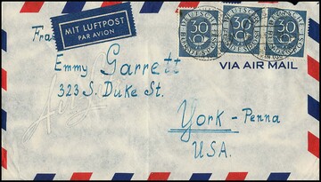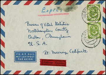 90 Pfg. im Paar als Mehrfach-Frankatur auf Übersee-Expreßbrief (Couvert oben kl. Randriß bzw. Fleckchen) von Bremen in die USA